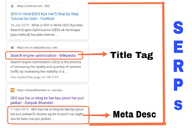 - Meta Description- मेटा डिसक्रिप्शन का हालांकि हमारी ranking से कोई सीधा लेना-देना नहीं होता है लेकिन एक अच्छा मेटा डिसक्रिप्शन लोगों को SERPs में हमारी पोस्ट पर click करने के लिए लालयित करता है।